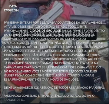 No texto, o grupo criminoso afirma estar “firme e forte dentro do estado” e tenta demonstrar domínio territorial, citando São José como um dos principais focos da atuação. A mensagem também menciona supostas execuções recentes, usadas como forma de intimidação e “exemplo” para quem, segundo eles, teria se aliado a facções rivais.